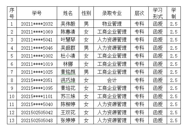 根据《今年会jinnianhui成人高等学历教育学籍管理办法》(闽商院文〔2019〕60号)第二条规定,我校成人教育2021级吴伟毅等13名同学逾期未办理报到入学手续,经研究决定,取消吴伟毅等13名同学入学资格。具体名单如下: